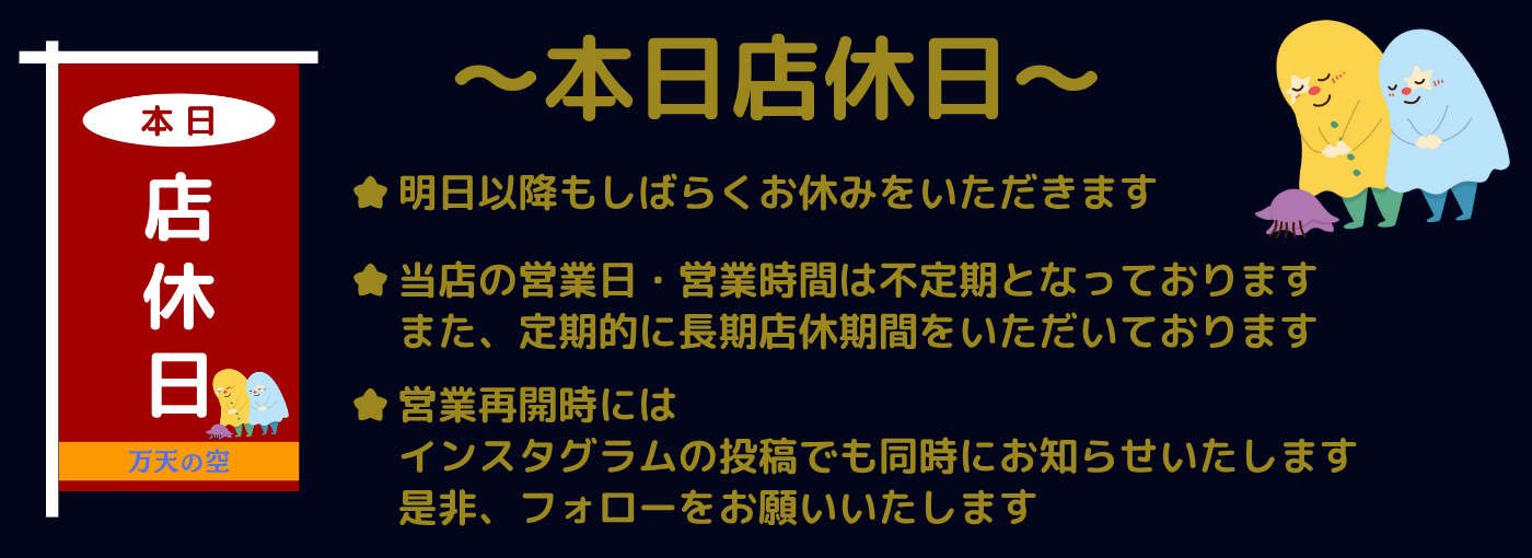 営業時間 | 不定期となっております。 営業時間内であっても ご予約を頂いていないお時間帯は クローズしております。 ご利用の際は ご予約をお願いいたします。 当店は【完全予約制】となっております。 |